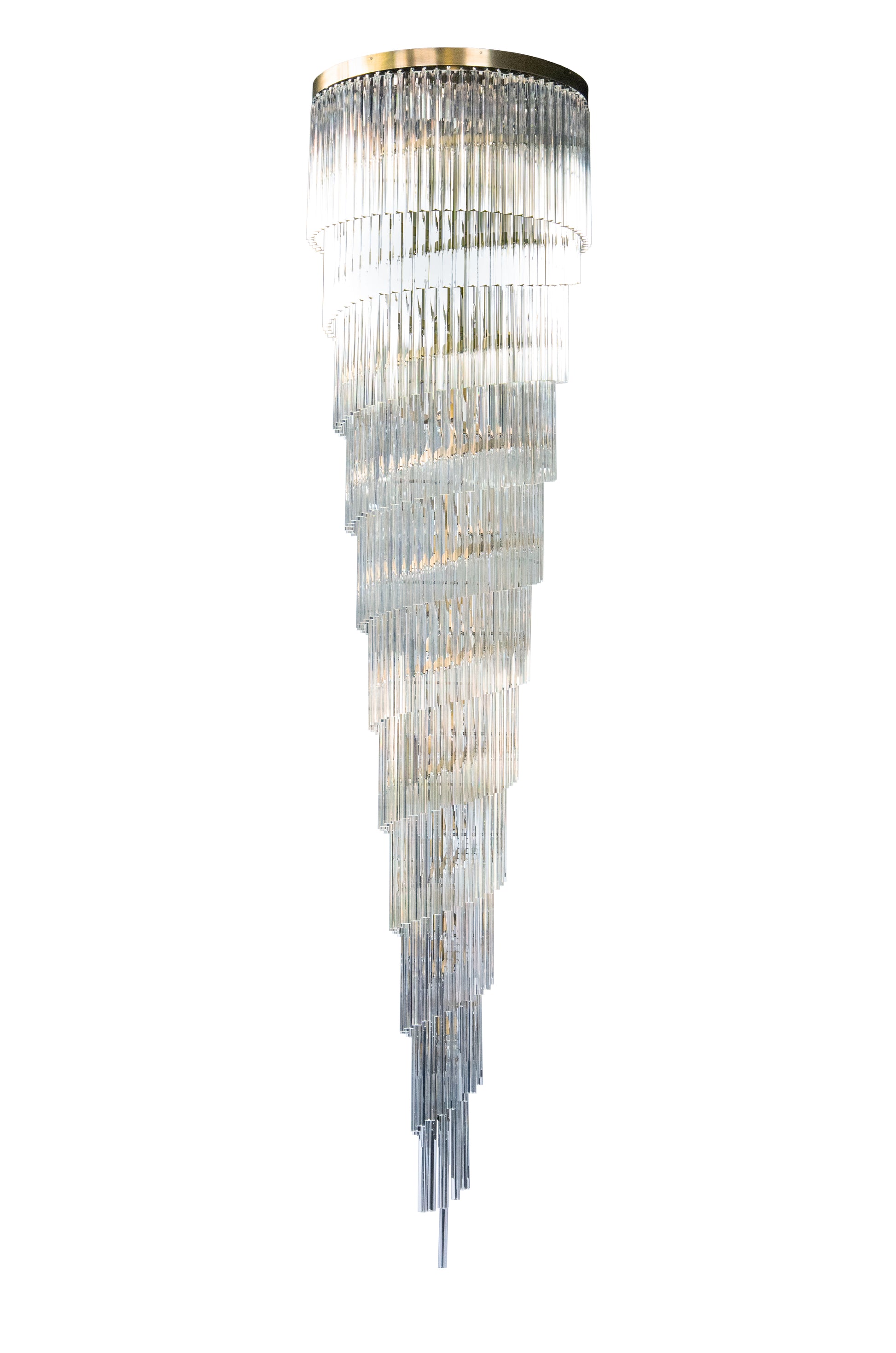 En modern variant av en Art Deco krona. Handslipade och handpolerade långa trekantsprismor. Klassiskt utförande med handgjord stomme av massiv mässing i lätt antikoxiderat utförande. Handbunden med extra kraftig genuin mässingstråd och handslipade helkristallprismor av förstaklasskvalitet. 40 stycken lamphållare E 14 inuti kronan. Specialtillverkad för en hög, smal trapphall. Helt hantverkstillverkad.